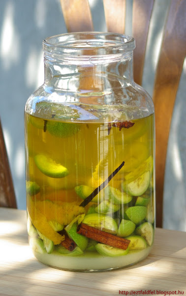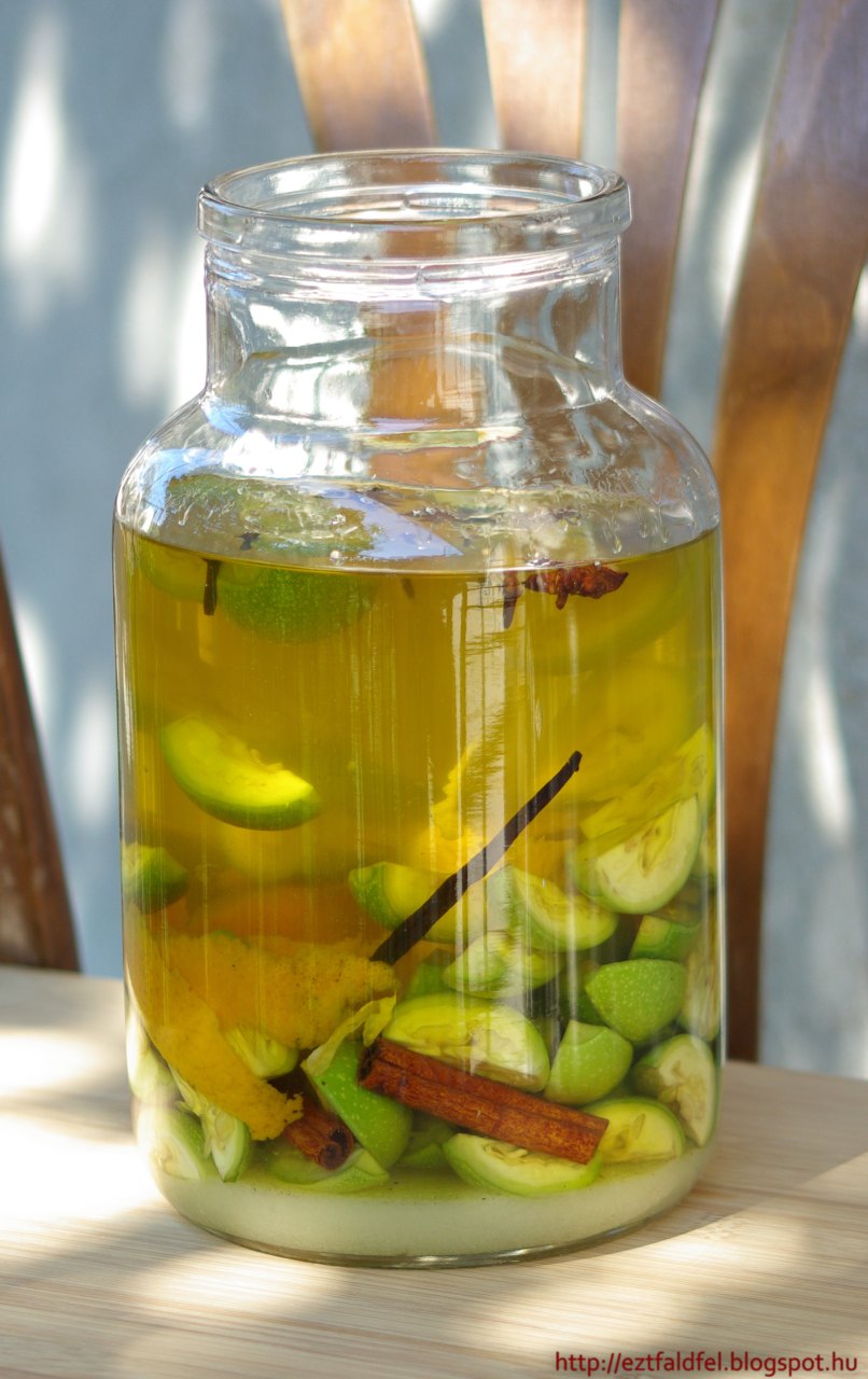 Nekünk összesen 2.3 liter lett belőle. Palackozva tegyük a kamrába, és várjuk vele legalább két-három hónapot (most is megkóstolhatjuk, de még kissé nyers az íze), a legjobb azonban, ha karácsonyig nem nyúlunk hozzá. Addigra a most még haragoszöld likőrnek be kell barnulnia szépen, és az ízek, aromák is összeérnek.