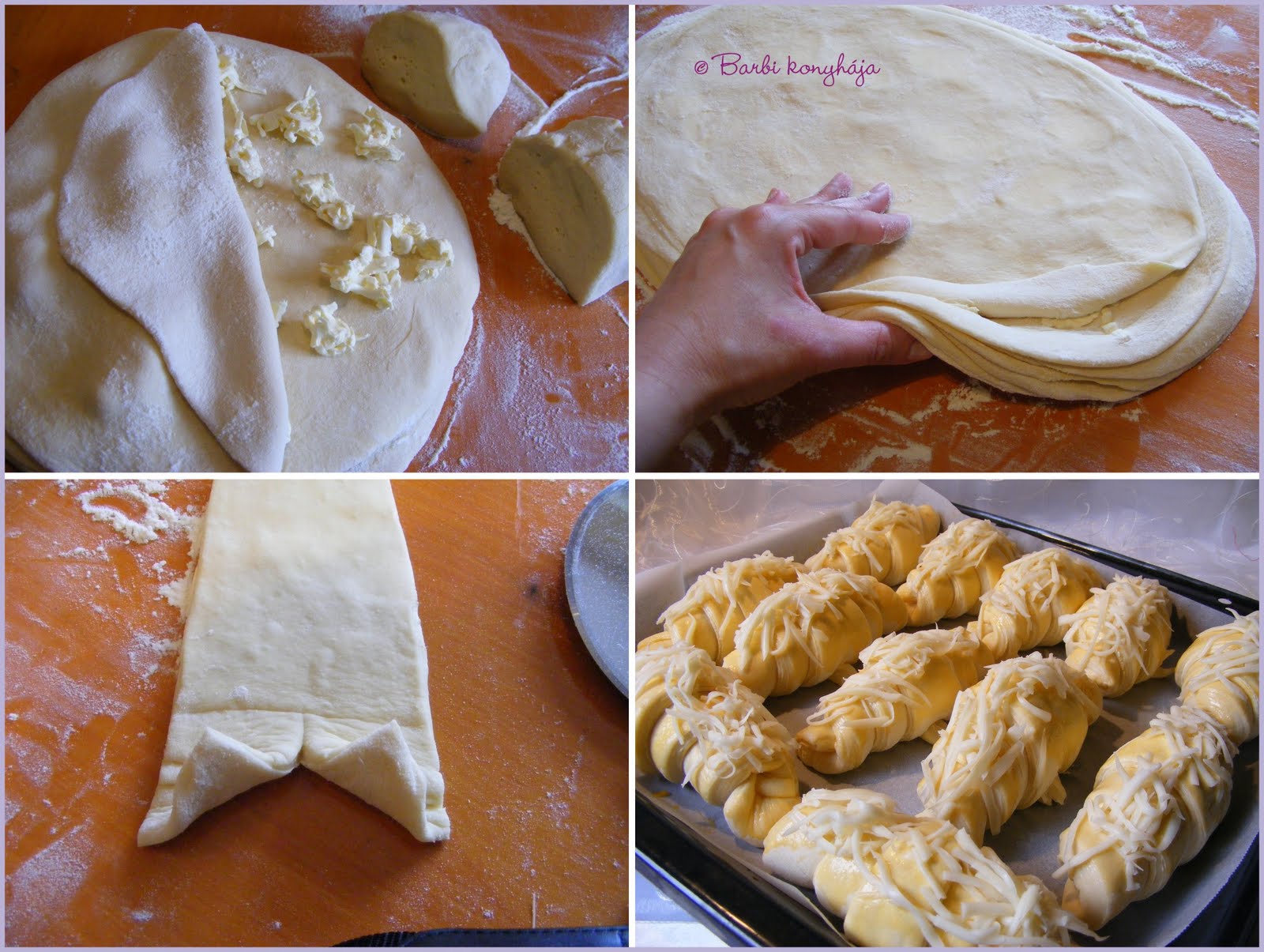 A fotón látható módon a háromszögek szélesebb végét középen bevágva és széthajtva feltekerjük, így nem lesz annyira buci a kifli. Sütőpapírral bélelt tepsire sorakoztatjuk, majd mehetnek egy éjszakára a hűtőbe, és reggel tojással lekenve, sajttal megszórva, hideg sütőben kezdjük sütni, 180 fokra állítva, kb. 25-30 percig vagy pirosodásig.