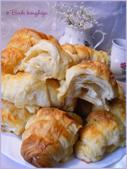 Holnap kirándul a nagylányom és mivel nem volt itthon semmi pékárú amit szendvicsnek készíthetnék és nagyon lusta voltam oda-vissza 30 km-t autózni pár zsemléért, ezért gyorsan benéztem Limarához, mert emlékeztem egy gyorsan elkészíthető croissant-ra. Jól emlékeztem, és már el is készült! Nem mondom, hogy pik-pak, de megérte, mert mi ilyen finomságot "kiflibe" még nem ettünk! Hát igen, talán tényleg szentségtörés kiflinek nevezni ezt a csodálatos pékterméket! ? Most az a legnagyobb problémám, hogy megmenekítsek holnapra párat a kirándulásra!!! :-) Ahhoz képest, hogy ma ünneplem - őszintén bevallom mindenki előtt - életem utolsó 3-as számmal kezdődő szülinapját, igencsak megdolgoztattam magam, de nem bánom! ☺