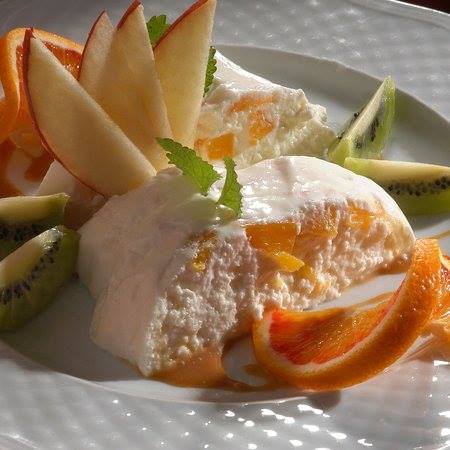 Formába öntjük és 1 napra hűtőbe tesszük, majd tálcára borítjuk és gyümölcsökkel díszítjük.