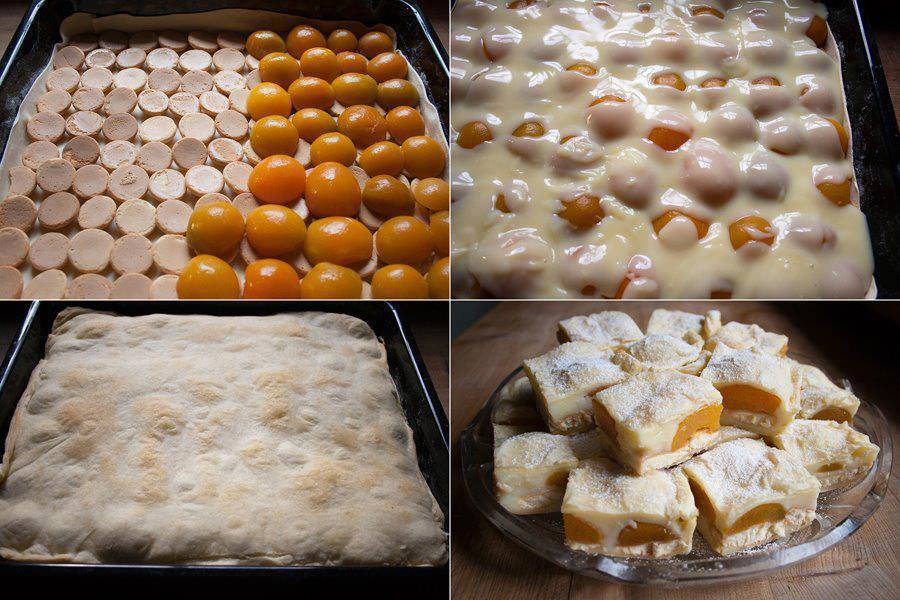 1 csomag leveles tészta ,felét kisodorjuk és tepsibe rakjuk,majd rárakunk szorosan babapiskótát (gömbölyűt),erre barackkompótot ,utána főzünk 1 liter tejből vaníliás pudingot ,(2 zacskó pudingpor) ráöntjük a barackra ,erre a másik leveles tésztát ráhelyezzük és megsütjük .