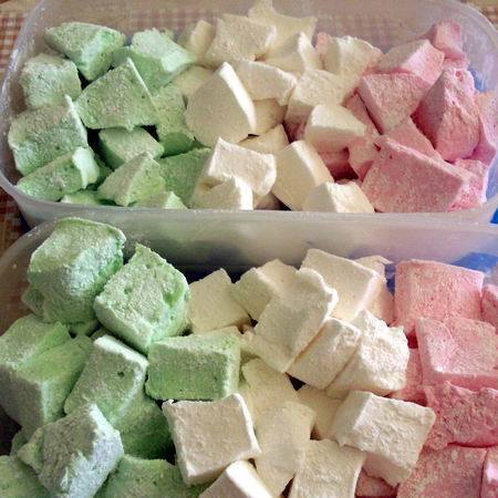 A pillecukrot ollóval tetszőleges formákra szabdaljuk, majd meghempergetjük a porcukor és keményítő keverékében.