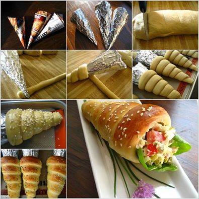 Papirból kúpokat készítesz, ahogy a képen van.. és bevonod alufóliával, és tészta hengereket rátekered.. A felvert tojás és tej keverékkel bekened..és sütőbe tolod őket..