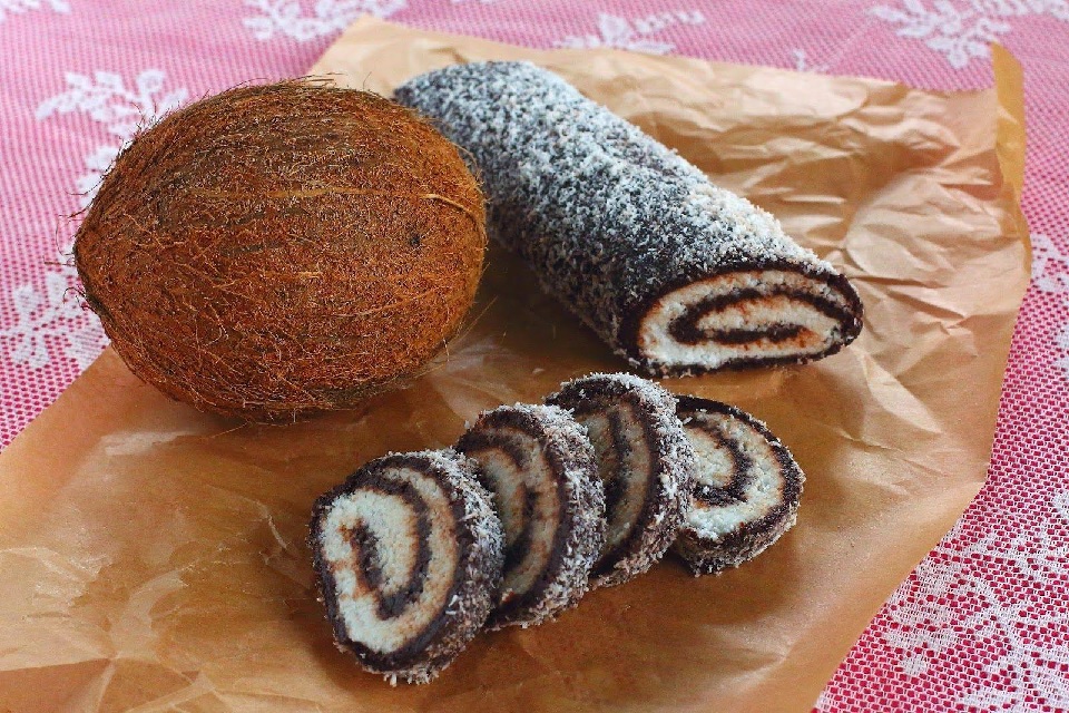 A barna rész valamennyi hozzávalóját turmixgépben vagy késes aprítóban sima masszává dolgozzuk. (Ha a datolya nagyon száraz, akkor előtte 1-2 órára áztassuk be vízbe, hogy megpuhuljon!) Két sütőpapír közé téve a masszát 20 x 25 centis téglalappá nyújtjuk. Rásimítjuk a fehér részt, amihez szintén valamennyi hozzávalóját turmixgépbe vagy késes aprítóba téve krémesítjük. Szorosan feltekerjük (az alatta lévő sütőpapír segítségünkre lehet a tekerésnél). Belegörgetjük a kókuszba és 3-4 órára, még jobb, ha egész éjszakára hűtőszekrénybe tesszük mielőtt szeletelnénk.