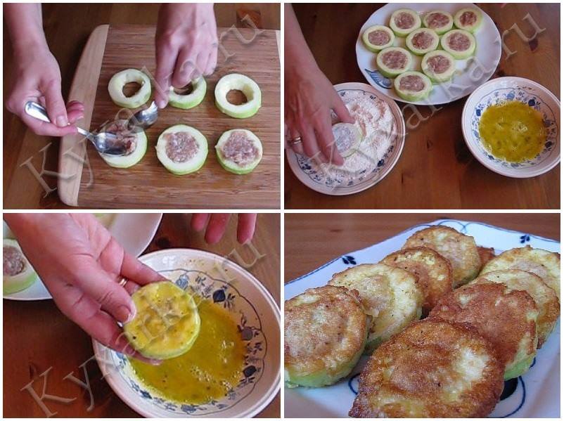 - Vágd fel a cukkinit 1,5 - 2 cm vastagságú szeletekre, ha zsenge akkor akár a héját is rajta hagyhatod. A képen látható módon vágd ki a közepét. Tölts meg fasírtnak befűszerezett darált hússal. Forgasd meg a szeleteket lisztben és tojásban, majd olajban süsd ki.