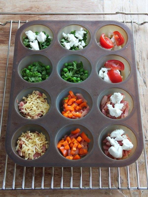 7 tojás és 2 evőkanál tej, egy kis sóval és borssal. Egy muffin forma, melyet kikenünk. Belerakod amit otthon találsz, pl. zöldborsó, sajt gomba, szalonna, paradicsom és paprika, és majd ezt a tojásos keveréket ráöntjük. 15-20 percig süssük a sütőben 180 °-on ropogósra sütjük